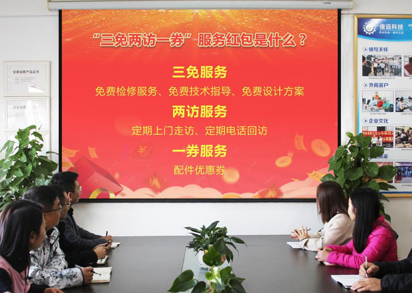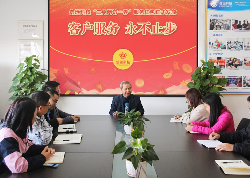 2021年11月25日上午,安徽信遠(yuǎn)包裝科技有限公司組織召開“客戶服務(wù) 永不止步—“三免兩訪一券”服務(wù)紅包正式發(fā)放”啟動儀式,信遠(yuǎn)科技常務(wù)副總經(jīng)理鐘總主持啟動儀式,各相關(guān)部門主要負(fù)責(zé)人參加了會議。