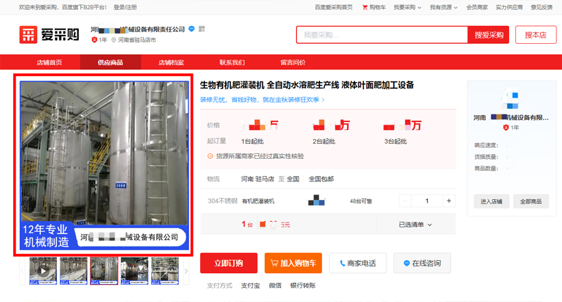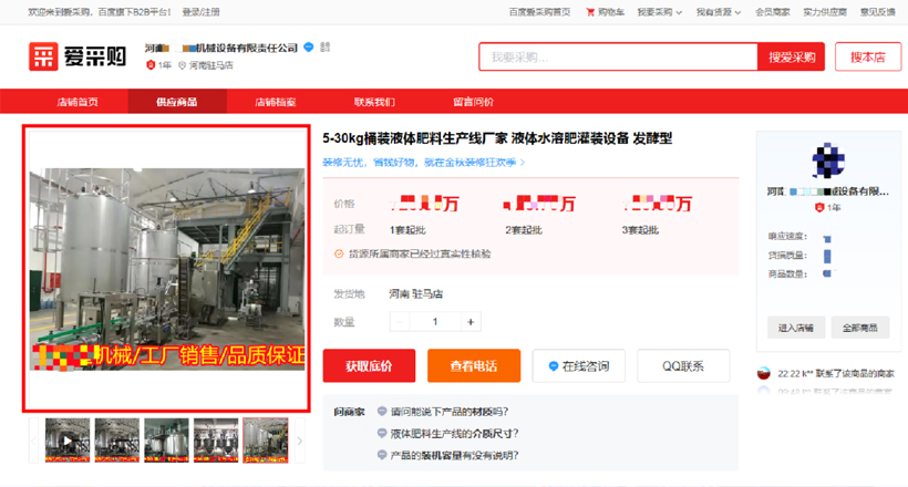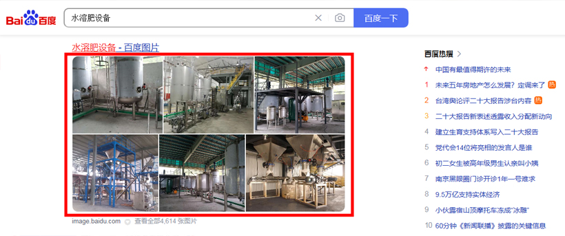 以下是在百度愛采購平臺上,同行商家盜用我公司設(shè)備圖片的截圖。大家可以通過百度搜索引擎、百度愛采購等平臺,搜索“水溶肥設(shè)備”、“水溶肥生產(chǎn)線設(shè)備”、“液體水溶肥設(shè)備”、“粉劑水溶肥設(shè)備”等不同關(guān)鍵詞,只要和肥料相關(guān)的設(shè)備宣傳信息,基本都可以搜到同行商家在盜用我們的設(shè)備圖片資料。