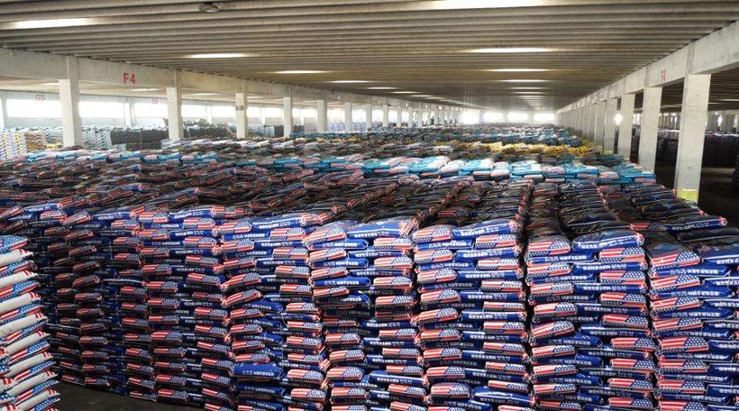 這套生產(chǎn)線設(shè)備是原料經(jīng)過人工投料后,配混設(shè)備會把不同配方的物料元素按照不同的配置比例進行自動配料和自動混合。混合均勻后的原料輸送至包裝機上方的儲料倉斗內(nèi),倉斗內(nèi)的物料通過快慢兩級螺旋給料的方式充填進包裝袋中,包裝過程為全自動化作業(yè),無需人工參與,即可完成自動上袋、夾袋和充填物料,待稱重傳感器檢測到袋內(nèi)物料重量達到設(shè)定數(shù)值時,自動停止充填、并自動松袋落袋,落在輸送帶上的包裝袋將會自動運送至自動折邊縫包機前進行縫包成品。成品袋在輸送過程中,自動完成倒包、振實、壓平等理包整形后,由機器人完成碼垛入庫,日產(chǎn)量可以達到100噸左右。