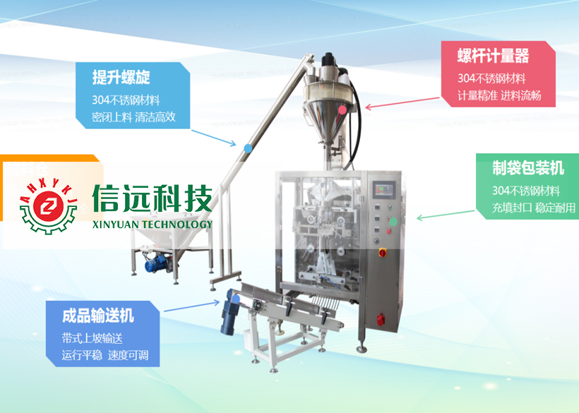 信遠(yuǎn)科技粉劑全自動(dòng)立式制袋包裝機(jī)組,是由密閉螺旋提升機(jī)、螺旋計(jì)量機(jī)、立式制袋包裝機(jī)和成品輸送機(jī)組成,可以包裝單袋克重在30-5000g范圍之間的粉狀物料,生產(chǎn)企業(yè)可以根據(jù)自己的需求選擇不同的包裝機(jī)型號(hào)。這套機(jī)組設(shè)備適合粉料和較大粉塵的超細(xì)粉狀物料的定量包裝,具有自動(dòng)完成送料、計(jì)量、制袋、充填、封口、切包、打印、計(jì)數(shù)、輸送等一系列功能,是食品、化工、醫(yī)藥等行業(yè)提高包裝生產(chǎn)效率,打造無塵環(huán)保車間,提升包裝檔次的必選設(shè)備。