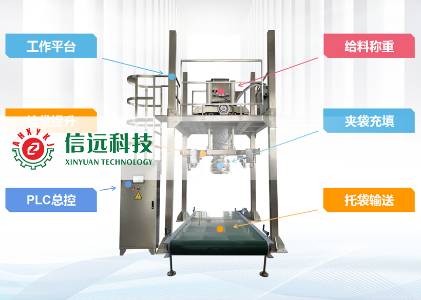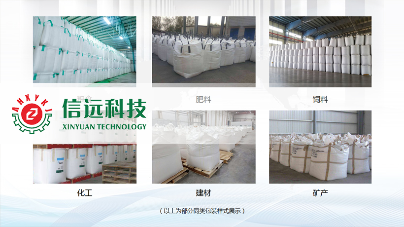 信遠科技全自動噸袋包裝機組,廣泛應用于電力、煤炭、石化、化工、化肥、糧食、飼料、冶金、環(huán)保、建材、塑料、橡膠、染料、新材料等行業(yè)大型軟袋顆粒物料或粉狀物料的自動定量包裝。