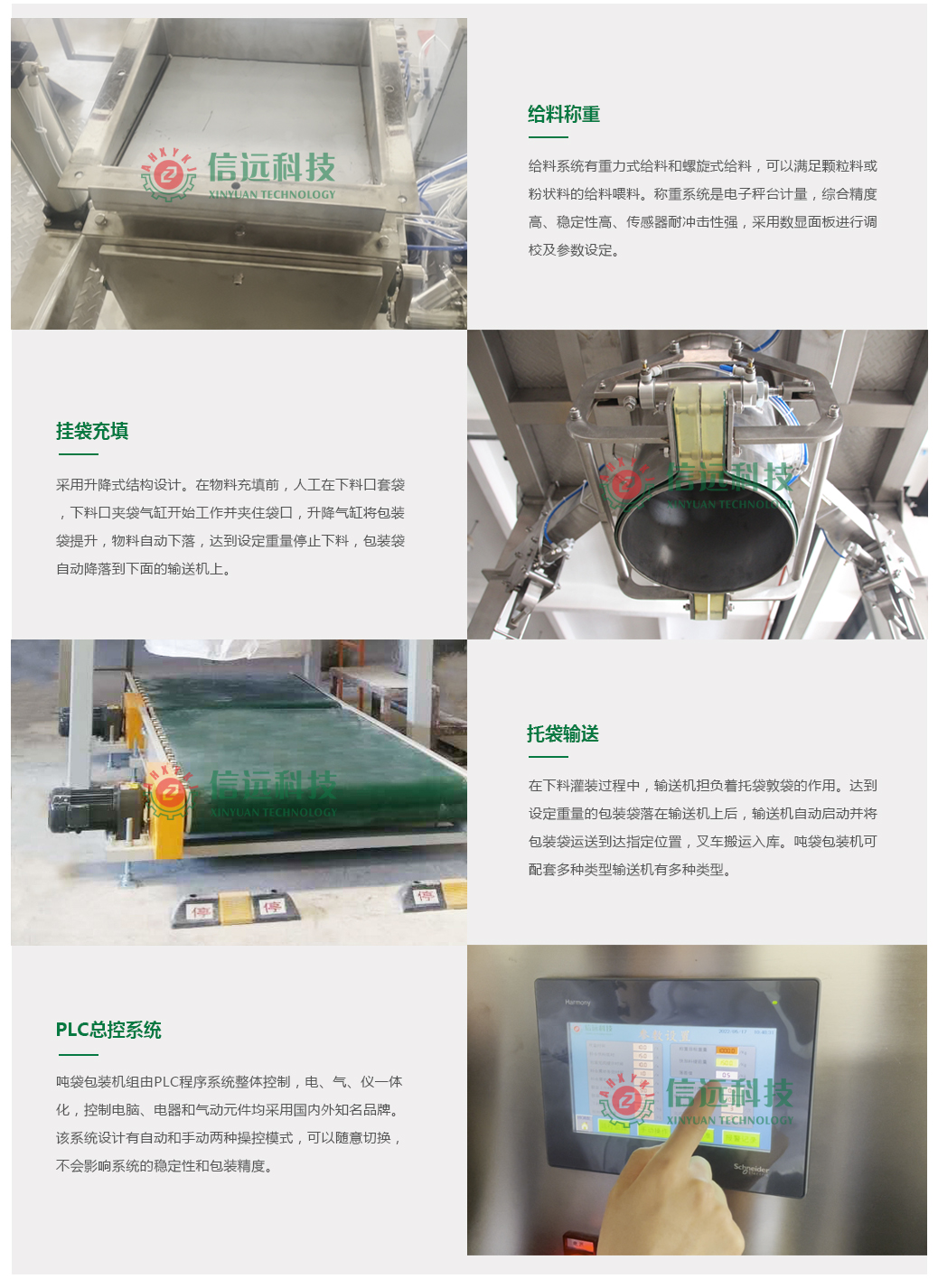 信遠科技全自動噸袋包裝機組,通過高精度傳感器,自動完成夾袋、吹袋、計量、灌裝、落袋、脫帶、輸送等工作程序。操作簡單方便,自動化程度高,灌裝精度高,灌裝速度快,灌裝重量可以在500-2000公斤之間調(diào)節(jié)。可以滿足高精度、高速度、高生產(chǎn)能力的大型軟袋定量包裝,適用于肥料、化工、建材、糧食、飼料、礦產(chǎn)等行業(yè)。這款噸袋包裝機組,不但可以節(jié)省大量的勞動力成本和包裝成本,減輕勞動強度,還可以大大提升計量精度和包裝效率,可謂是大型軟袋包裝生產(chǎn)的“重器”。