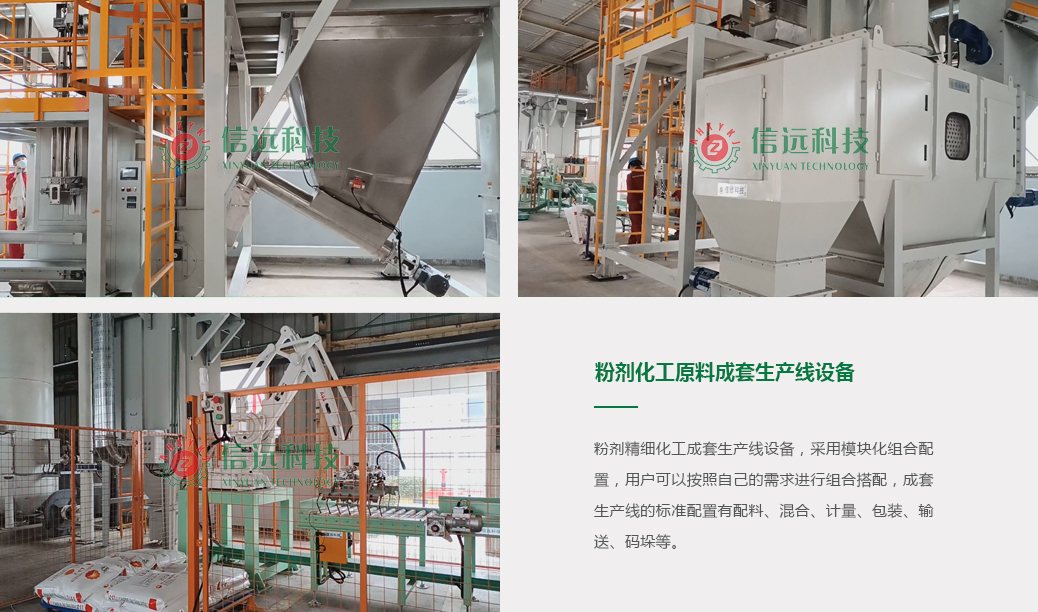 信遠科技推出的粉劑精細化工成套生產(chǎn)線設備,采用模塊化組合配置,用戶可以按照自己的需求進行組合搭配,成套生產(chǎn)線的標準配置有配料、混合、計量、包裝、輸送、碼垛等。其中包裝機提供了重袋、中袋、小袋包裝規(guī)格,包裝機類型有全自動和半自動,有單工位和雙工位,下料口有固定式和升降式。在充填環(huán)節(jié)配置有脈沖式除塵系統(tǒng),可以有效抑制粉塵外揚,整條生產(chǎn)線具有精準高效、清潔環(huán)保的綜合優(yōu)勢。
