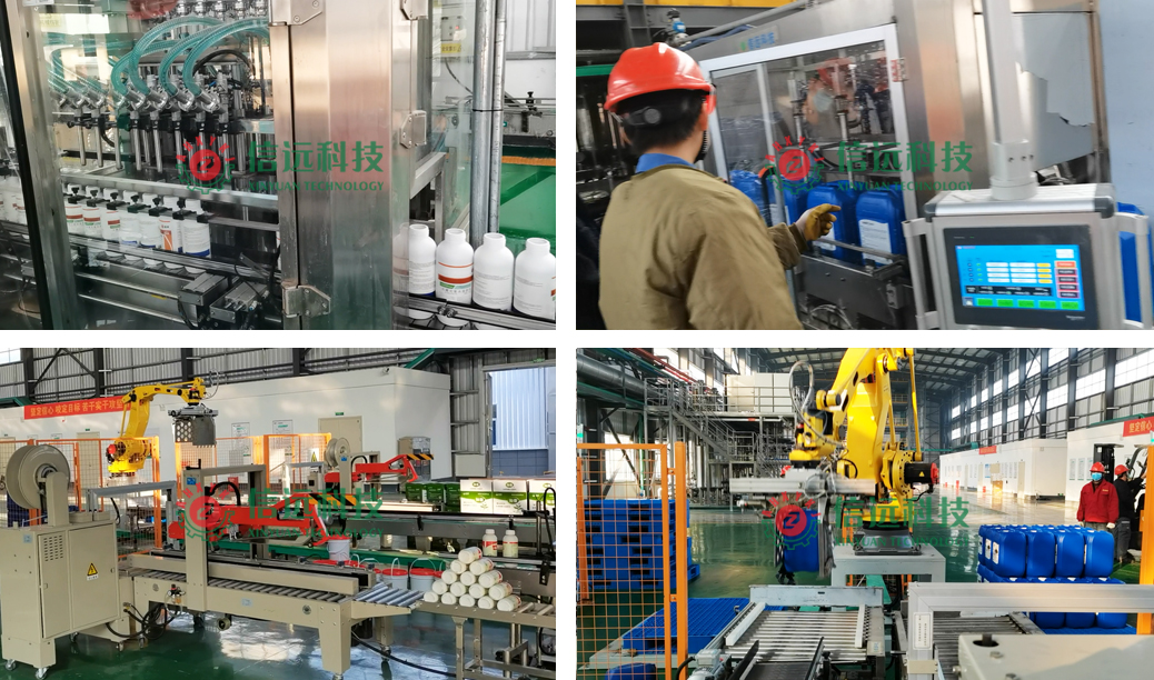 瓶裝灌裝系統(tǒng)適用于100-1000ml容量范圍內(nèi)的液體肥產(chǎn)品灌裝。可以自動完成理瓶進(jìn)瓶和計量灌裝,當(dāng)瓶內(nèi)重量達(dá)到設(shè)定值時,自動停止灌注,在輸送系統(tǒng)的推動下,出瓶至自動上蓋旋蓋、鋁箔封口和噴碼貼標(biāo)工段,自動上箱開箱機(jī)把空箱輸送至裝瓶工段,當(dāng)箱內(nèi)裝滿設(shè)定瓶數(shù)后,進(jìn)入箱碼關(guān)聯(lián)、封箱捆扎和機(jī)器人碼箱工段,完成成品下線。桶裝灌裝系統(tǒng)適用于5-30L容量范圍內(nèi)的方桶、圓桶、廣口桶和小口桶的液體肥產(chǎn)品灌裝??梢宰詣油瓿缮贤斑M(jìn)桶、稱重灌裝、上蓋壓蓋/旋蓋、噴碼追溯和機(jī)器人碼桶等作業(yè)工序,成品由叉車搬運(yùn)入庫。
