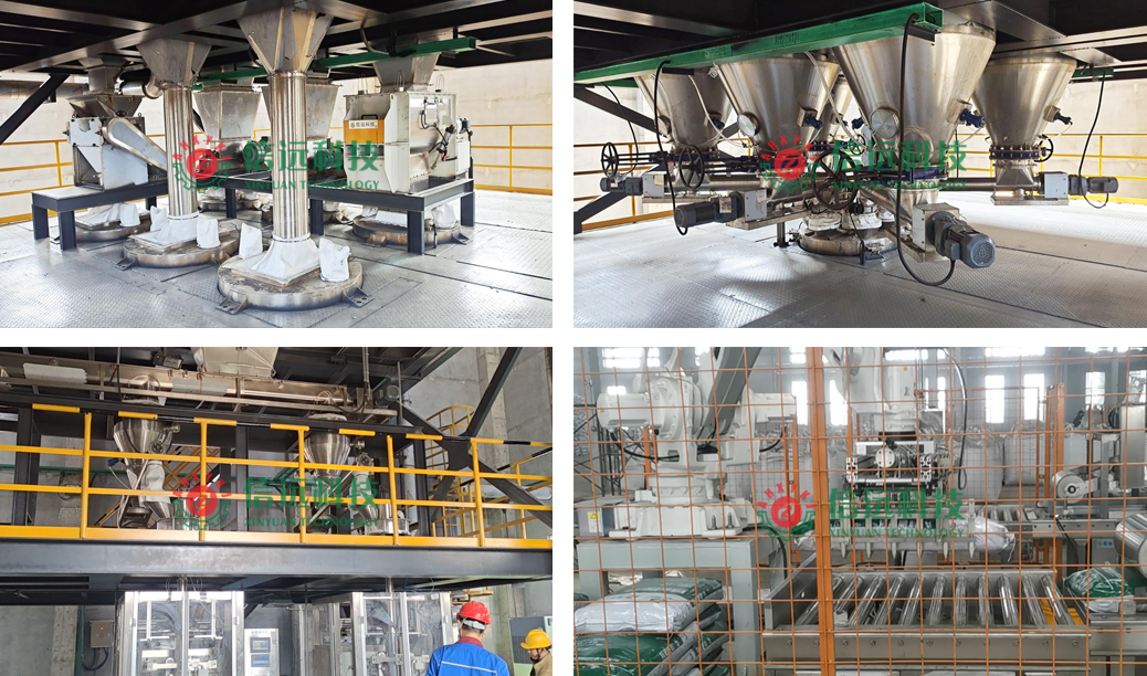 該套自動化藥肥生產線為塔式立體結構設計,由投料系統(tǒng)、預處理系統(tǒng)、配料系統(tǒng)、混合系統(tǒng)和包裝系統(tǒng)組成。配方原料通過升降機運送到投料平臺,完成藥、肥原料的投送;結塊原料、顆粒原料經過破碎、粉碎處理,進入配混環(huán)節(jié);包裝環(huán)節(jié)設備配置有全自動重袋上袋包裝機和全自動小袋制袋包裝機,可以生產不同克重規(guī)格的袋裝粉劑藥肥產品。