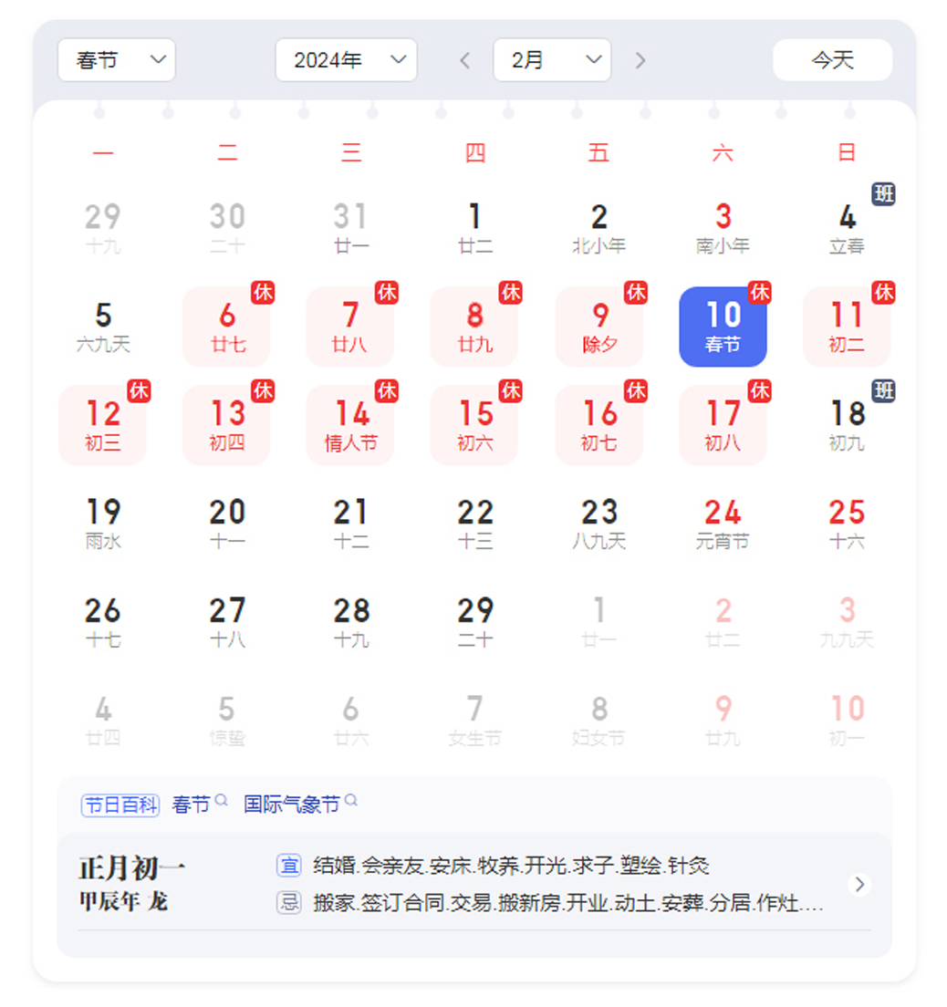 根據(jù)《國務(wù)院辦公廳關(guān)于2024年部分節(jié)假日安排的通知》精神,結(jié)合公司實際情況,現(xiàn)將2024年春節(jié)放假安排通知如下:2024年2月6日(臘月廿六)至2月17日(正月初八),共12天。2月18日(正月初九)正式上班。