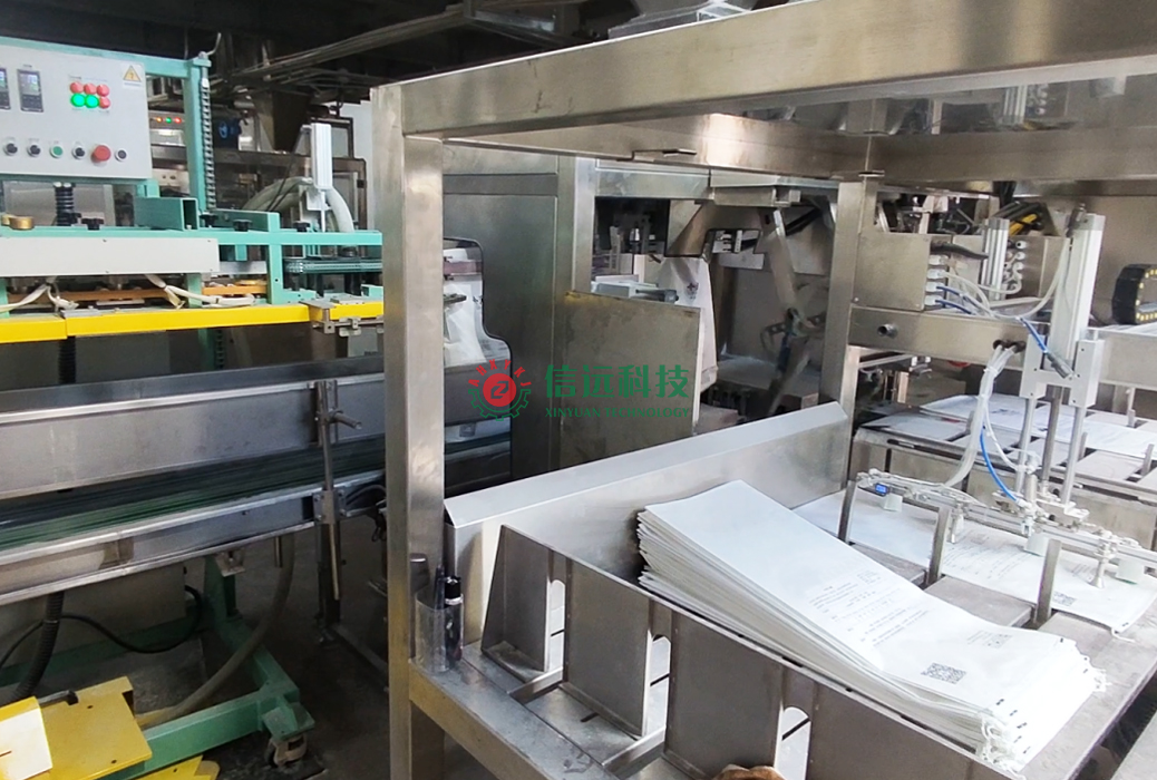 信遠科技全自動包裝碼垛生產(chǎn)線,可以采用單工位或雙工位袋庫模式,自動切換工作方式,在電機驅(qū)動下,實現(xiàn)供袋和移袋功能。兩個水平排列的袋庫可存儲200個空袋(視包裝袋厚度而定);雙臂上袋機械手,仿生結(jié)構(gòu),自主設計,多種包裝袋均能適用;充填物料后的包裝袋在下料落袋的同時,由移動小車上的抱袋、夾袋裝置將抱住整個料袋,袋口同時夾住送至導袋輸送裝置,導袋裝置與封口系統(tǒng)相連,在進入封口傳動鏈中,保證袋口平整有序的進入折邊縫包系統(tǒng),完成料袋的全過程包裝控制。