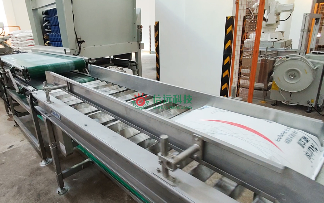我們先講水溶肥生產(chǎn)線的理包輸送系統(tǒng),該系統(tǒng)可以在輸送過程中,自動完成理包整形,是一套為終端碼垛提供平整料袋的自動化輸送線。該線由倒包輸送機(jī)、爬坡輸送機(jī)、彎道輸送機(jī)、振實(shí)輸送機(jī)、壓包輸送機(jī)、緩存輸送機(jī)、抓袋輸送機(jī)、噴碼機(jī)等組成,輸送速度快、料袋整形效果好。各種輸送機(jī)主體結(jié)構(gòu)采用不銹鋼材質(zhì)制造,扎實(shí)耐用,穩(wěn)定性好,便于維護(hù)。