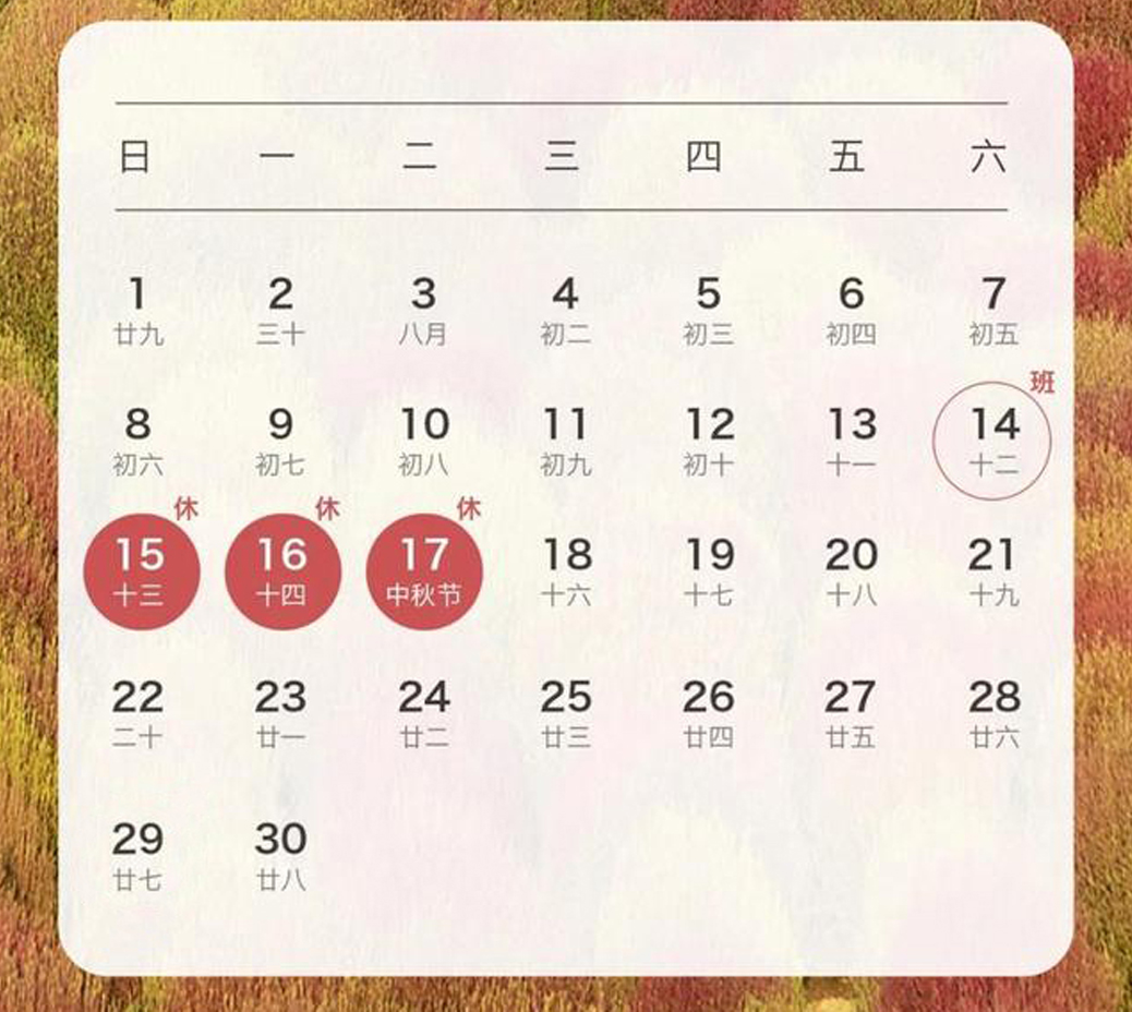 根據(jù)《國務(wù)院辦公廳關(guān)于2024年部分節(jié)假日安排的通知》精神,結(jié)合公司實(shí)際情況,現(xiàn)將2024年中秋節(jié)放假安排通知如下:9月15日(星期日)—9月17日(星期二)放假,共三天。9月14日(星期六)正常上班。