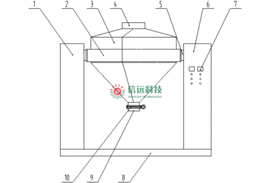 信遠科技方錐型混合機為立式結構,采用單錐體回轉堆積度物料比,進行交叉錯位混合,通過電機帶動減速機,并依次帶動帶輪、皮帶、轉軸、框架2和料筒3轉動,順時針為正轉,逆時針為反轉,達到混合效果,均勻度高。料筒3由制動電機任意傾斜定位角度,便于出料及清潔的需要。設有自動定時裝置,通過電控板7任意設置,可設定0~60分鐘自動停止。采用不銹鋼蝶閥10放料,無粉塵泄漏和飛揚現(xiàn)象出現(xiàn)。采用重力擴散原理混合,對物料的壓饋小,不會對物料產(chǎn)生剪切粉碎。料筒3采用304優(yōu)質(zhì)不銹鋼板制作,內(nèi)壁鏡面拋光處理,外表面亞光處理。大容積的混合機可配置真空上料系統(tǒng),提高工作效率和改善工作環(huán)境。