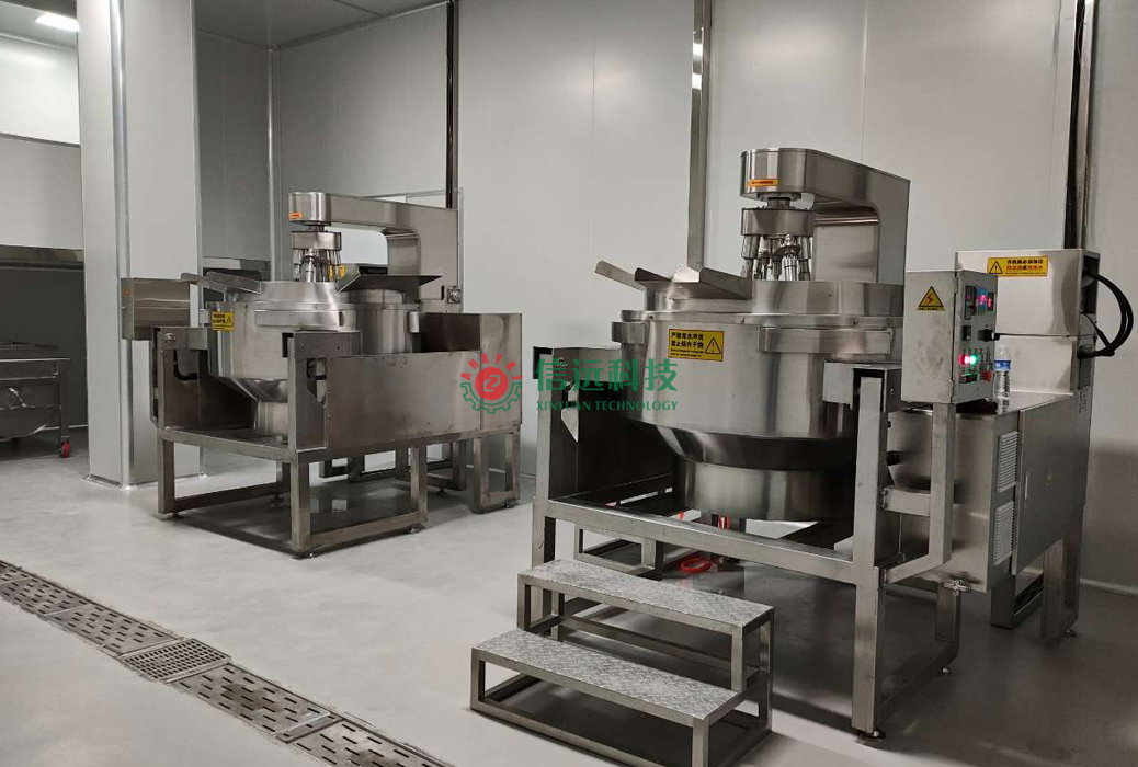 信遠科技電磁炒鍋熬油炒料一體機,容積大、產(chǎn)量高、升溫快、溫度高,攪拌無死角,不粘鍋、糊鍋,配有溫度顯示裝置,可設定溫度,到達溫度自動斷電??蓪崿F(xiàn)單控、雙控,從而調(diào)控功率大小。其外掛設計更人性化,操作、清洗使用更合理,液壓傾斜倒料系統(tǒng)更穩(wěn)定可靠,被廣泛應用于食品業(yè)加工中。適用于各種高粘度醬料的攪拌加熱蒸煮炒制:肉制品熟食加工業(yè)(魚子醬、肉醬、海鮮醬),調(diào)味品業(yè)(火鍋底料、燒烤醬料、方便面醬料),蔬菜醬類業(yè)(辣椒醬、香菇醬、蘑菇醬)等食品加工業(yè),生產(chǎn)的醬料質(zhì)量穩(wěn)定,效果好。