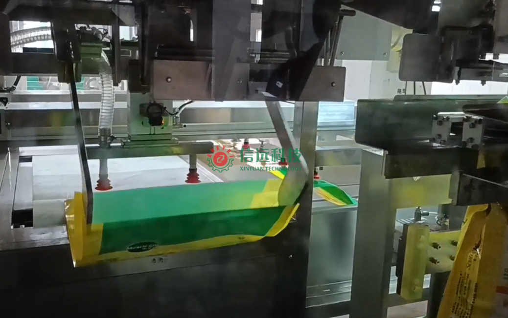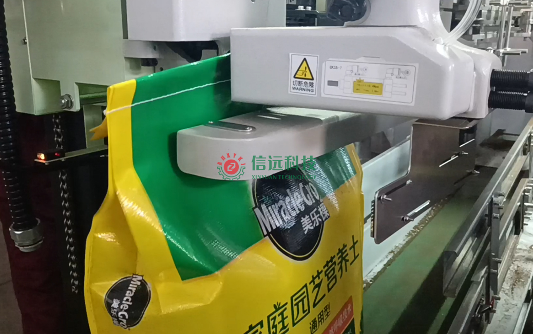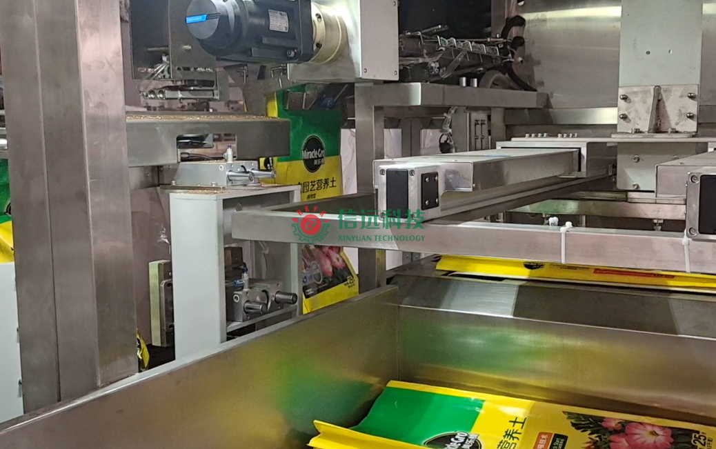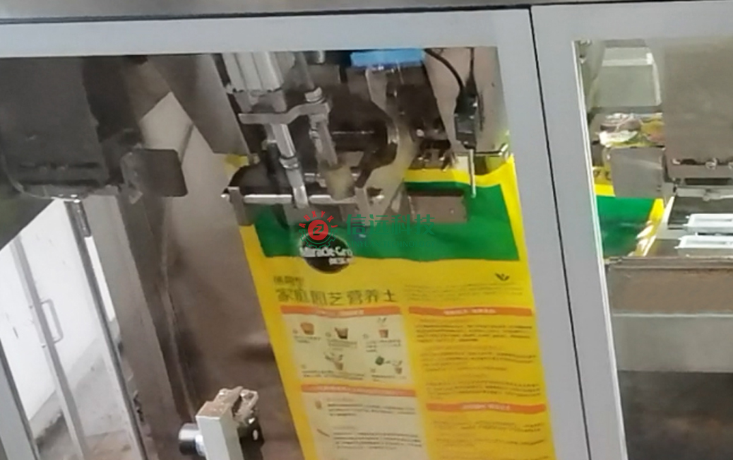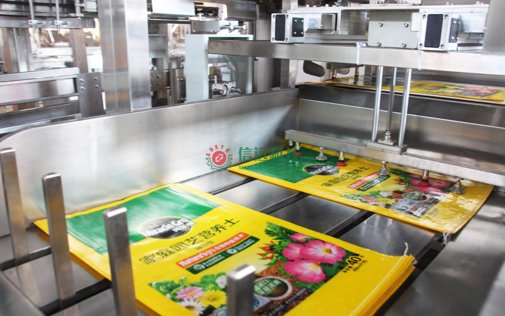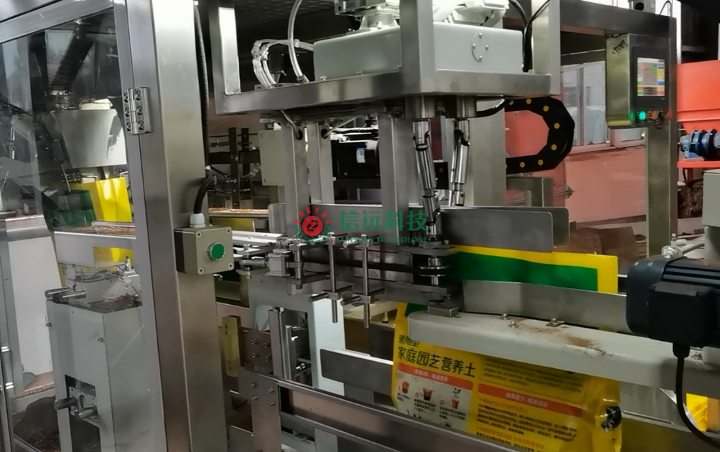 安徽信遠包裝科技有限公司作為國內(nèi)知名的農(nóng)資農(nóng)化設(shè)備專業(yè)制造商,按約為該品牌營養(yǎng)土生產(chǎn)商提供了成套的自動化包裝機設(shè)備,該設(shè)備是一套給袋式重袋包裝系統(tǒng)。生產(chǎn)流程是配方原料通過計量料倉喂料至重袋包裝機,在前端上袋機的配合下,自動完成取袋、上袋、套袋、夾袋、計量、充填、抱袋、振實等作業(yè);包裝機后端與縫包機相聯(lián),在導(dǎo)袋機構(gòu)和皮帶輸送機的配合下,自動完成移栽、導(dǎo)袋、折邊、縫合、剪線等工序,完成成品輸出。