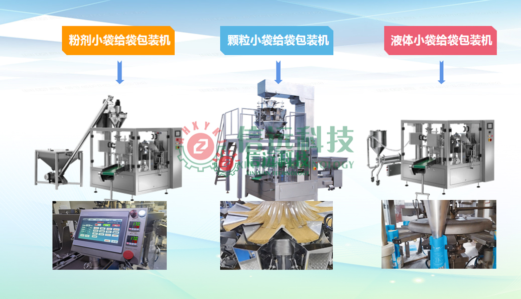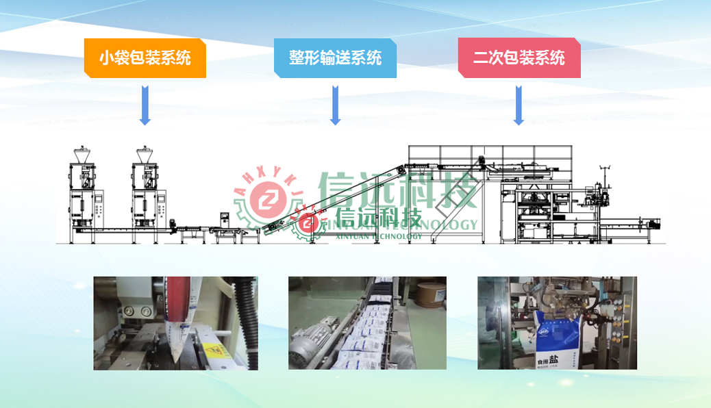 信遠(yuǎn)科技食鹽/砂糖包裝生產(chǎn)線設(shè)備,由提升裝置把物料送至緩存?zhèn)},通過(guò)量杯式計(jì)量機(jī)對(duì)食鹽/砂糖進(jìn)行定量填充至包裝袋,封口后的包裝袋經(jīng)過(guò)重量選別機(jī)和剔除機(jī)完成產(chǎn)品標(biāo)準(zhǔn)化,然后通過(guò)夾袋提升裝置送至二次大袋包裝環(huán)節(jié)。小袋包裝機(jī)分為制袋式包裝機(jī)和給袋式包裝機(jī)。整個(gè)包裝過(guò)程為無(wú)人化運(yùn)行,保證了物料衛(wèi)生與安全。