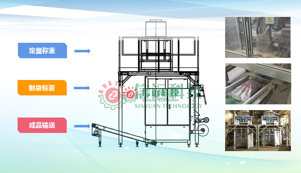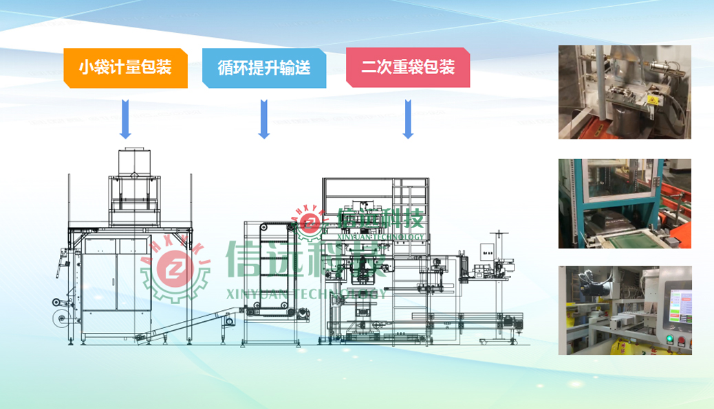 信遠(yuǎn)科技飼料二次包裝生產(chǎn)線設(shè)備,采用PLC控制系統(tǒng),可以實現(xiàn)小袋自動計量包裝、整形輸送、循環(huán)提升、進(jìn)包整理、計數(shù)充填、外袋二次包裝、袋口整形、取貼標(biāo)簽、折邊縫包、理包碼垛等全過程的自動化生產(chǎn)運行??梢园b粉狀或顆粒狀的魚蝦育苗飼料產(chǎn)品,循環(huán)提升機(發(fā)明專利)大大減少了場地占用空間,是飼料生產(chǎn)企業(yè)實現(xiàn)自動化包裝的新型設(shè)備。
